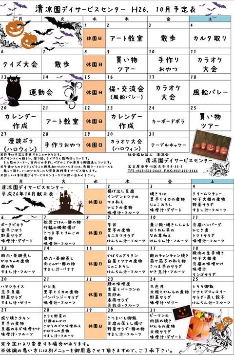 清凉園デイサービスセンター9月の予定と献立表が出来上がりました。
